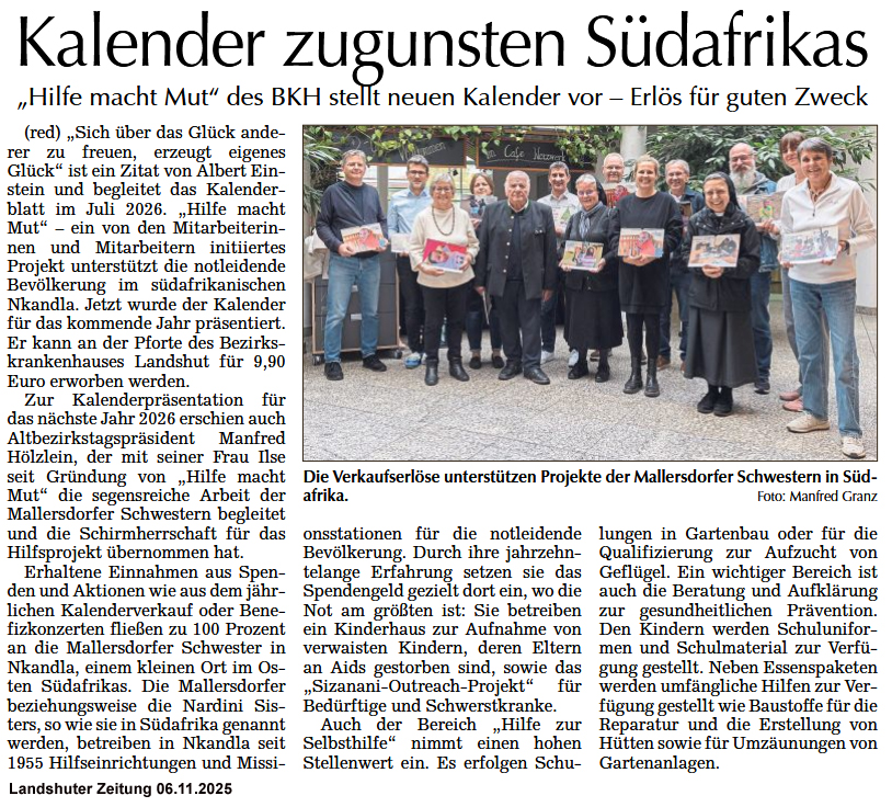 Das Patenschaftsprojekt „Hilfe macht Mut“ des Bezirkskrankenhauses (BKH) Landshut unterstützt die Mallersdorfer Schwestern in Südafrika seit fast 20 Jahren. Vor Kurzem übergab das Patenschaftsteam einen Scheck in Höhe von 35000 Euro an die Mallersdorfer Schwestern. Das Geld stammt von Spenden und verschiedenen Aktionen. (Allgemeine Laber-Zeitung)